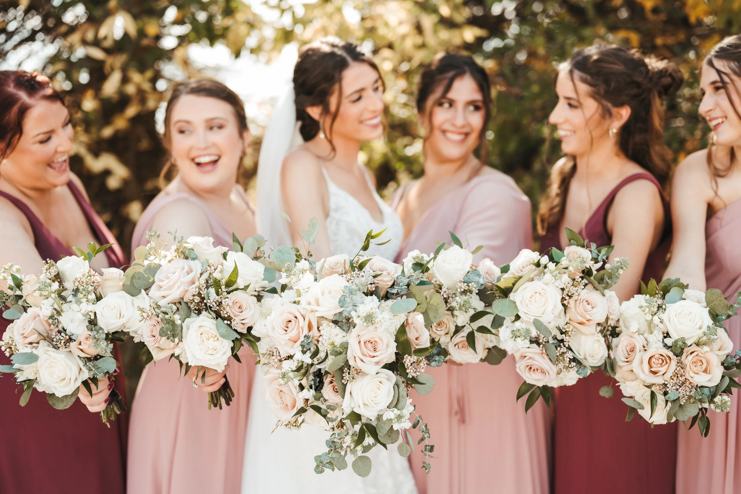 After a beautiful ceremony, guests cheered as the couple exited the church under flowing streamer wands, the breeze catching each one perfectly. The wedding party made a quick stop at Riverbend Bar, celebrating with champagne, shots, and a stunning river backdrop — the very same place where Alex and Bethany took their first photo together the day they met. (Yes, seriously. The full-circle moment was perfection.)